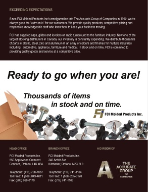 FCI has supplied caps, glides and levelers on rapid turnaround to the furniture industry. Now one of the
